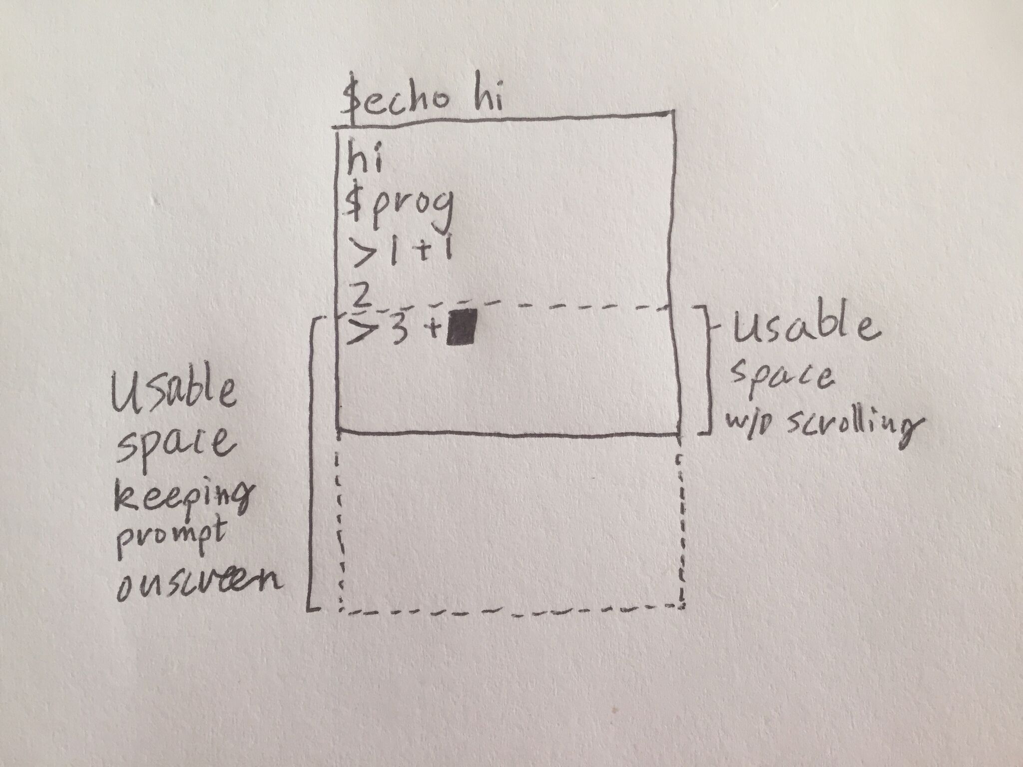 When writing this kind of program it’s useful to consider two separate canvases available for drawing the current line and interface widgets like autocomplete suggestions: space that can be drawn in without causing the terminal to scroll down, and space that can be drawn in that would cause the terminal to scroll, but would keep the cursor onscreen.